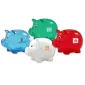 The promotional piggy has a twist off plug on bottom. Complies with ASTM, CCPSA, CPSIA, Prop 65. 4 1/4" W x 3 1/4" H x 3 1/4" D