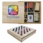 Keep this game set at the office or take it when you travel. Inside the wooden box is everything you need for a mean game of cards, dice, chess, checkers, dominoes, or cribbage. Complies with Prop 65. 10.375" W x 10.375" H x 1.75" D