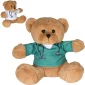Adorable brown plush bear available in your choice of 2 medical themed t-shirt. Choose from white doctor's lab coat stock art or teal nurse scrubs stock art. Medical themed stock art comes pre-printed on the front of each shirt, add your logo to complete the message. No decoration available directly on the plush animals. Toy safety tested to ASTM F963 specification. Complies with ASTM, Prop 65. 7.75" W x 7" H x 5.75" D