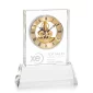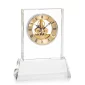 The exquisite optical crystal Ashland Clock on Base features a captivating skeleton movement, showcasing the intricate golden gears and mechanisms within. Mounted on a colored base of your choice from eight vibrant options, it offers a personalized touch to suit any decor. Combining elegance and precision, this clock's transparent design and gleaming golden accents create a timeless centerpiece for any room or office. Second position etch is optional. 6.0" W x 7.75" H x 2.375" D