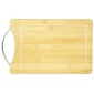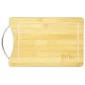 Crafted out of durable, eco-friendly Bamboo. Ideal for chopping, preparing, and serving. Perimeter groove keeps juices contained. Stainless steel handle for easy carrying. Hand wash recommended. Due to the natural variations in wood, boards can vary in color and pattern. 13" D x 7.75" W x 0.625" H