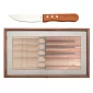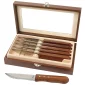 Set includes six steakhouse knives presented in wooden storage box with a glass presentation window. Each knife is crafted from durable Stainless-Steel. Rosewood handles are secured to a full tang with triple rivets and are contoured for a secure, comfortable grip. Sharp serrated edges on the blade are designed to cut through meat easily. The silver accent chest latch on the box secures knives for transport and storage. Utensils made with FDA compliant materials. 6.625" D x 11.125" W x 2.25" H
