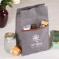 Cooler bag, bolder brand with the Axel Lunch Cooler Bag. Made with trendy grey 600D polyester & exquisite brown vegan leather trim, buckle, & carrying strap, this bag redefines lunch experiences. Front pocket provides a dedicated space for small items while the PE foam & PEVA lining keep meals cool & fresh. Fold-over top with a secure buckle closure guarantees a tight seal. Give your brand a tasteful makeover with this stylish, functional, & reliable lunchtime convenience. Complies with Prop 65. 8" W x 12.5" H x 5" Diameter