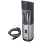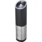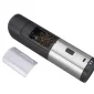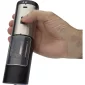 Power button and gravity activated, turn upside down to get fresh ground spice or seasoning. Black Plastic housing w/ Stainless Steel accent. The blue LED light when the grinder is in use. Ceramic grinder on the top helps keep surfaces free of residue. Adjustable grinder knob can choose the coarseness. Refillable container at the back can hold a large amount (2.9oz/85ml). Can be powered by 4 AAA alkaline batteries (not included). Includes 4 rechargeable batteries and Type-C charging cable. 2" D x 2" W x 8" H