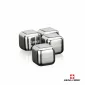 Set of 18/8 Stainless Steel ice cubes chill longer than regular ice- Food grade, gel-filled cubes are a non-diluting substitute to ice- Keep drinks, beverages and fine liquor cold without losing flavor- Place cubes in the provided pouch and freeze for about 4 hours- No freezer burn, taste or smell like regular ice and no messy leaking- Set of 4 cubes with natural canvas pouch in magnetic closure gift box- These reusable cubes are long-lasting and an expression of pure elegance