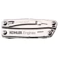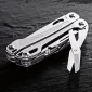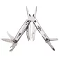 4" closed. All stainless steel. 14 Tools: Half-serrated knife, three screwdrivers, package opener, ruler, spring-action needlenose & regular pliers, spring-action scissors, wire cutters & stripper, bottle & can opener, wood/metal file. Comes with removable pocket clip. Made in the USA of US & Foreign Components. Nylon Sheath Included. Complies with Prop 65.
