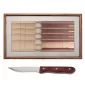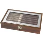 Set includes six steakhouse knives presented in wooden storage box with a glass presentation window. Each knife is crafted from durable Stainless-Steel. Rich Manchurian Ash handles are secured to a full tang with triple rivets are contoured for a secure, comfortable grip. Sharp serrated edges on the blade are designed to cut through meat easily. The silver accent chest latch on the box secures knives for transport and storage. Utensils made with FDA compliant materials. 6.625" D x 11.125" W x 2.25" H