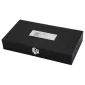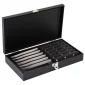 Set of 6 stainless steel (1.5mm blade thickness) steak knives in a black case with silver accent. Individual box. 10 5/8" W x 5 7/8" L x 3/4" H