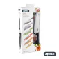 These knives are comfortable and easy to use with a soft touch grip handle to give each cook a more precise and controlled cut. The knives are made out of high quality Japanese stainless steel. Each knife comes with a matching blade cover. The set includes: Chefs Knife 19.1cm/7.5", Santoku Knife 17.8cm/7", Utility Knife 12.7cm/5", Serrated Paring Knife 9.5cm/3.75", Paring Knife 8.3cm/3.25", and Peeling Knife 6.4cm/2.5"
