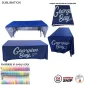 This product will ship in 1 business days if program requirements are met. Proofs not available. Accuracy of the artwork is the customer's responsibility. Laser Cut Premium Fabric, Premium Cut, Rounded Edges so it flows better on the corners. Three-sided table cover creates a lasting impression. Simple storage. Open back makes it easy to store materials. This table cloth will fit a standard 6' table. Compliant with flame retardants for exhibit halls. 128" W x 61" L