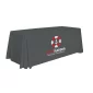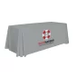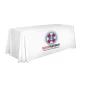 This table throw features a stain-resistant treatment that repels liquids instead of absorbing them. For use with tables 6' wide. Covers three sides of the table with a 9" overhang in back. Draped corners. Constructed of polyester poplin. Flame retardant treated (FR rated for exhibit halls). Machine-washable and wrinkle-resistant. One-year product warranty. Complies with NFPA, Prop 65. 30" L x 72" W x 28" H