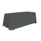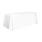 This table throw features a stain-resistant treatment that repels liquids instead of absorbing them. For use with tables 6' wide. Covers three sides of the table with a 9" overhang in back. Draped corners. Constructed of polyester poplin. Flame retardant treated (FR rated for exhibit halls). Machine-washable and wrinkle-resistant. One-year product warranty. Complies with NFPA, Prop 65. 30" L x 72" W x 28" H