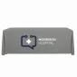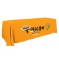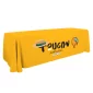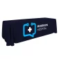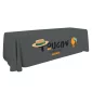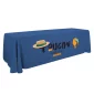 The open-back design of this throw gives you legroom and quick access to anything you store beneath the table. Constructed of polyester poplin fabric. For use with tables 8' wide. Covers three sides of the table with a 9" overhang in back. Draped corners. Flame retardant treated (FR rated for exhibit halls). Machine-washable and wrinkle-resistant; do not dry clean and do not iron. One-year product warranty. Complies with NFPA, Prop 65. 30" L x 96" W x 28" H