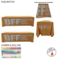LazerCut Premium Fabric, Premium Cut, Rounded Edges so it flows better on the corners. 1 piece of fabric (instead of 2 pieces sewn together). Four-sided table cover creates a lasting impression. Simple storage. Closed back makes it easy to hide materials underneath table. This table cloth will fit a standard 8' table. Compliant with flame retardants for exhibit halls. 152" W x 86" L