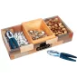 Introducing our versatile Wooden Tray, meticulously crafted with a captivating multi-wood pattern. With three sections, it's an impeccable storage solution for nuts, chips, or any dry snacks. Complete with two nutcrackers & a removable tray for shells or extra snacks, it offers unparalleled convenience. Beyond nuts, it's perfect for organizing cupboards or serving as a catch-all tray. Elevate your home with this functional & stylish essential! Complies with Prop 65. 20" W x 9.5" H x 9.5" H