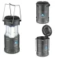 This is a camping style lantern with bright COB light and mini fan. Pull open to release light. Iron handles at top for carrying or hanging. Uses 3 AA batteries, included and replaceable. 5.125" H x 3.25" Diameter