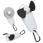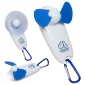 Portable hand fan and light combo, Rubber blades, Carabineer clip for easy hanging, Powered by 2 AA batteries, inserted, Sturdy ABS plastic. Complies with Prop 65. 1.875" L x 4.3125" W x 1.75" H