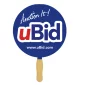 Four Color Process imprint white sandwiched hand fan. 12 point board stock with a wooden handle. Whether you decide to sponsor an event and pass this great product out there or if you just hand them out to passersby on scorching hot days, this hand fan is certain to bring a smile to anyone's face. Round fan, sandwiched, 4 Color Process. Complies with CPSIA, Prop 65. 7 1/2" Diameter