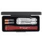 Two great brand names packaged together in a sleek presentation box. The 6.50" 2AALED Mini-Maglite has MAG-LED technology, can illuminate objects up to 156 feet away, comes with 2 "AA" batteries, and is available in black, blue, red, and gray. The all-stainless steel Leatherman Rebar has 17 tools: Knife, serrated knife, needlenose & regular pliers, electrical crimper, wire stripper, replaceable wire cutters, file, saw, ruler, three screwdrivers, awl, bottle & can opener, and a wood/metal file. L. Complies with Prop 65. 4" L
