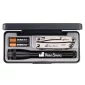 Two great brand names packaged together in a sleek presentation box. The 6.50" 2AALED Mini-Maglite has MAG-LED technology, can illuminate objects up to 156 feet away, comes with 2 "AA" batteries, and is available in black, blue, red, and gray. The all stainless-steel 4" Leatherman Sidekick has 14 tools: knife, serrated knife, three screwdrivers, ruler, saw, spring-action needlenose & regular pliers, wire cutters & stripper, bottle & can opener, wood/metal file. Comes with a removable pocket clip. Complies with Prop 65. 6 1/2" L