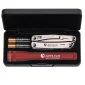 Two great brand names packaged together in a sleek presentation box. The 6.50" 2AALED Mini-Maglite has MAG-LED technology, can illuminate objects up to 156 feet away, comes with 2 "AA" batteries, and is available in black, blue, red, and gray. The all- stainless steel 4" Leatherman Wingman has 14 Tools: Half-serrated knife, three screwdrivers, package opener, ruler, spring-action needlenose & regular pliers, spring-action scissors, wire cutters & stripper, bottle & can opener, wood/metal file. C. Complies with Prop 65. 6 1/2" L