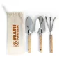 3 stainless steel tools with wooden handles The tool set is packed in a burlap bag Tools include a hand-held shovel, trowel and mini rake One color imprint included on the burlap bag Laser engraving on handles costs extra $1.5 ( G ); setup charge $45 ( G ). 13" L x 5" H