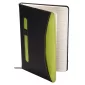 This journal has a textured faux leather black PU cover with a color accent front pocket and matching elastic pen loop (pen not included). It features a black satin polyester bookmark. It includes approximately 80 lined sheets. Complies with Prop 65. 5.75" W x 8.25" H x 0.625" D