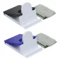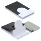 Two handy items in one, Conveniently stores microfiber cloth, 5" x 5" microfiber lens cloth included, Pops open to hold phone, Folds flat for storage. Complies with Prop 65. 2.375" L x 0.375" W x 3.75" H