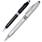 This is an aluminum twist action ballpoint pen. It has a soft silicone tip for use with iPads®, iPhones®, tablets and other touchscreen devices. It features black, medium-point ink. Laser Engrave imprint is with oxidation on item in silver only. Production time may vary due to imprint method. Complies with Prop 65. 5.375" L x 0.5" Diameter