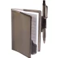 This Jotter has a soft PVC cover and a color matching click action ballpoint pen. It includes approximately 80 ruled pages. Pen loops lock cover when pen is inserted. Pen is medium point with black ink. Pen is 4 inches long. Complies with Prop 65. 3.375" W x 4.125" H x 0.25" D