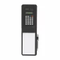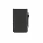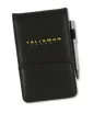 Faux leather top fold notebook with calculator inside on top, notepad on bottom, & silver metal pen (no imprint) in a side elastic pen loop. 3 1/2" W x 5 3/4" H