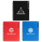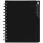 Introducing the Robust Recycled A5 Spiral Notebook with Pen, featuring a waterproof spiral notebook and a sleek ballpoint pen. Crafted from recycled PP material, both the front and back covers measure approximately 5.67 inches wide by 7.01 inches high, with a slim 0.24 inches depth. The back cover is equipped with an elastic pen loop adorned with a silver grommet on the right side, perfectly coordinated to match the cover color. Complies with Prop 65. 5.67" W x 7.01" H x 2.36" D