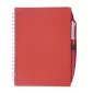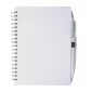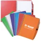 This wire-bound notebook features a durable and flexible translucent polypropylene cover, and includes 80 unlined sheets of 5''x6.875'' notebook paper and an elastic pen loop with pen. The included translucent color click action pen matches the color of the notebook, comes inserted, measures 5.33"L x 0.33" Diameter, and features black ink. We are unable to imprint on the pen at this time. Complies with Prop 65. 5.75" W x 7.125" H x 0.5" D