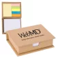 This recycled memo case is filled with a sticky pad, flags and non-adhesive memo paper. Comes with approximately 25 sheets per sticky pad and flag and 180 sheets of white note paper. Case is made of 70% recycled materials, and paper is made of 51% recycled materials. Loose white note paper measures approximately 4"w x 3.125"h and can be refilled with standard 4"x3" note paper or sticky pads found in most office supply stores. Sticky note pad and flags on inside lid are not refillable. Complies with Prop 65. 4.563" W x 3.75" H x 1.25" D