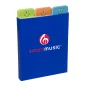 This is a set of 3 sticky pads in a 250 GSM cardboard cover with matte lamination. Each pad features a different emoti™ theme character on header. Each sticky pad design includes approximately 30 sheets of 80 GSM paper (each pad measures approximately 2.91"w x 4.13"h). Top of each sticky pad includes green, orange, and blue color tab identifier. Complies with Prop 65. 3" W x 3.5" H x 1" D