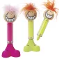 Playful highlighter featuring colorful turkey feather hair and a giant grin. Ink color matches polypropylene plastic barrel and PVC cap. It features a chisel-tip highlighter that has a free-standing color-coordinated feet-shaped base. Base serves as ink cover. Complies with Prop 65. 1.75" W x 5.5" H x 1.5" D