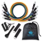 This kit includes 5 resistance bands, 2 handles, 2 ankle straps, 1 door anchor/mount, 1 storage pouch, and instructions. Each 56"l band is a different color, which represents different resistance strength: Yellow (10 Lb.); Red (15 Lb.); Green (20 Lb.); Blue (25 Lb.); Black (30 Lb.). The polyester pouch has a front open pocket and drawstring closure. Complies with Prop 65. 10.5" W x 12" H