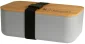 This Bento Lunch Box with Bamboo Lid is made from plastic (PP) mixed with wheat fiber. The set contains a fork, a spoon, a knife and an elastic band. Individual plastic bag. 7 5/8" L x 2 13/16" W x 4 1/2" D