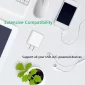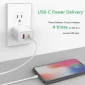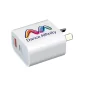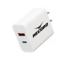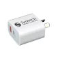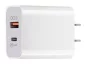 Compact, quick, 20W, dual port charger that charges 3 times faster than a regular unit. The input is 100-240V 50-60Hz 0.5A the USB-C Output is 5V=3A, 9V=2.5A, 12V/1.67A and the USB-A Output is 5V=3A, 9V=2A, 12V/1.5A. Features include a 1 year warranty and item is tested before shipping. Complies with CE, FCC, Prop 65, RoHS. 63mm W x 43mm H x 24mm D