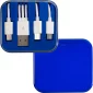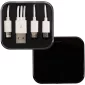 USB multi-cable in square case. Includes 3 cables micro USB, USB type C, and duo 5pin+micro USB. Base is made of ABS Plastic, case lid is made of AS Plastic, and cable is made of PVC. Power/Technology: Input is 5V, Output is 1A, USB 2.0. Cables may be used simultaneously. Not an Apple® authorized product, use at your own risk. Note: USB-C is for charging only, no data transfer function. Complies with Prop 65. 2.5" W x 2.36" H x 1.18" D