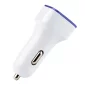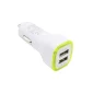 This dual port USB car adapter plugs into you vehicle's cigarette lighter jack to become a charger. Simply connect your USB cable to power up your devices: phones, cameras, PDAs and other devices from the comfort of your car. Lightweight, compact and stylish this 2 port USB car charger has a white base and colorful rim that lights up when in use. Features include a 1 year warranty and item is tested before shipping. Complies with CE, FCC, Prop 65, RoHS. 60mm W x 25mm H x 25mm D