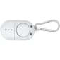 Two built-in LED lights to help in dark/low light areas. The carabiner easily clips to keys, bags or purses. Simply press the button for light on/off. You activate the emergency alarm by simply pulling the pin. The alarm is 100-110 decibels & can be heard up to 175-225 feet depending on surrounding conditions. Light has a beam distance of 19M, is impact resistant up to 3M & has a brightness of 3 lumens. Complies with Prop 65. 1.5" W x 3" H