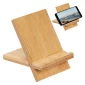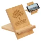 The Bamboo Portable Phone Stand is constructed of renewable eco-friendly bamboo and comes as two slotted pieces perfect for flat mailing, travel or easy storage. The two pieces on the bottom slot together to create phone stand that fits most smartphones vertically or horizontally. Complies with Prop 65. 3" L x 0.375" W x 4.875" H