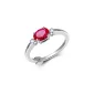 ELLE "Holiday Stars" rhodium plated sterling silver 7x5mm oval created ruby and lab grown diamond 2x1.5PT round (F/C H-I/I1) solitaire ring. Size 6. Gift box included. Complies with Prop 65.