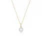 Cubic zirconia 8.5mm round pearl solitaire necklace in sterling silver with 18K gold plating. 18" length. Gift box included. Complies with Prop 65.