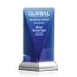 The deep optical crystal blue of the Rubicon Award tapers to narrow bevels which allow the edges to glow with graduated color and light. The base of mirror topped, brushed nickel finish metal base gives added sparkle to the inside of the crystal award. 6.0" W x 9.0" H x 2.5" D