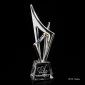 Cast metal triangle sculptures intersect with a bright 24k gold or fine silver finish to create this sleek, modern sculpture of gallery quality beauty. Each piece is mounted to a beveled optical crystal base. 13.25" H