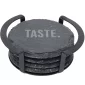 Ensemble de 4 dessous de verre ronds en ardoise avec support en métal noir.