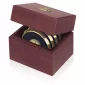 Fabriqué en cerisier massif, ce coffret contient quatre dessous de verre de qualité supérieure. Choisissez une finition plaquée laiton (comme montré) ou en zinc (argent). Ajoutez-y un médaillon sur mesure assorti pour créer un cadeau à chérir. Les dessous de verre sont dotés d'un dos en liège pour protéger les meubles, le cuir est enduit d'uréthane pour résister aux taches. Si quatre ne suffisent pas, un ensemble de six est disponible (25018). Conforme à la proposition 65. 5,5" L x 4,875" H x 4,875" P