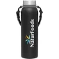 Bouteille thermique en acier inoxydable 18/8 à double paroi de 32 oz avec isolation sous vide en cuivre, couvercle fileté en acier inoxydable isolé, anneau en silicone, sangle amovible avec boucles, fermoirs amovibles et finition en poudre. Boîte cadeau individuelle. Lavage à la main recommandé. Ne pas mettre au micro-ondes. Conforme à la FDA, Prop 65. 11" H x 3.1875" L.